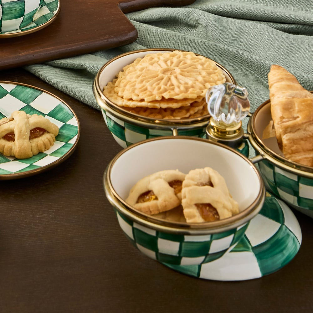 The Emerald Check Triplicity brings a little height to your kitchen displays while saving on precious counter space. The stand and accompanying 1.5 cup Pinch Bowls are hand-glazed heavy-gauge steel with hand-painted Emerald Check decoration. The bowls remove from the stand for easy cleaning.
