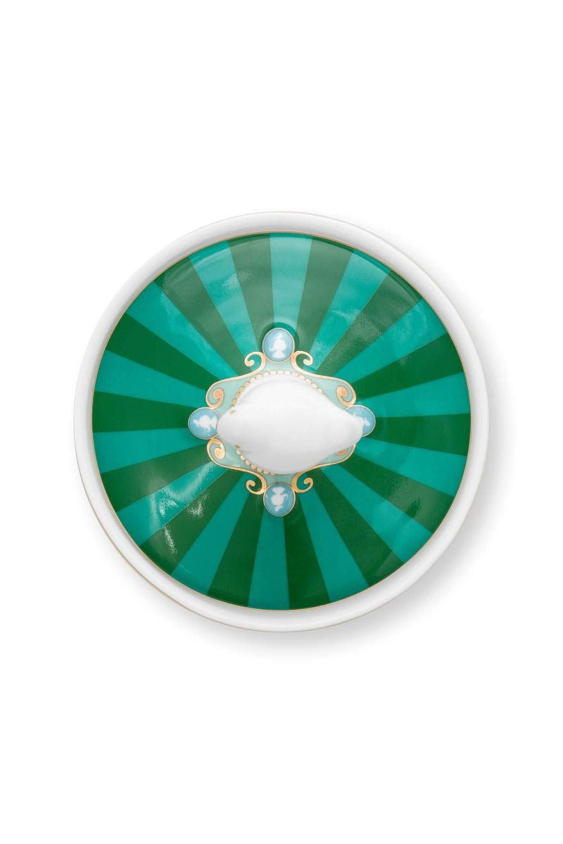 This green sugar bowl is part of Pip's all-time favourite Love Birds design. Decorated with a gold edged border. The eye catching centre piece is a bright coloured robin. Combines beautifully with the other porcelain items from this collection.