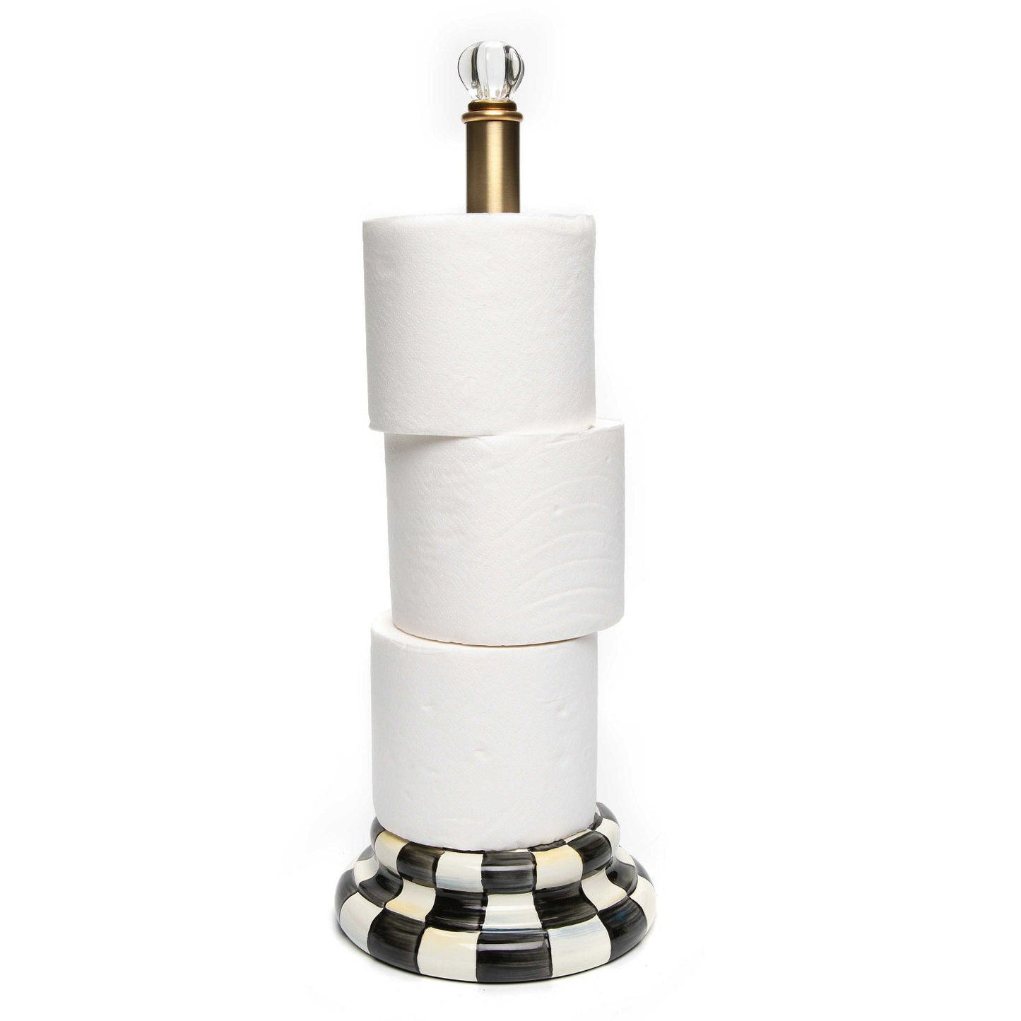 Keep the essentials stylishly handy with the Courtly Check® Enamel Toilet Tissue Storage. Made of heavy-gauge steel and decorated with hand-painted Courtly Check and a glass knob finial, it holds three rolls.