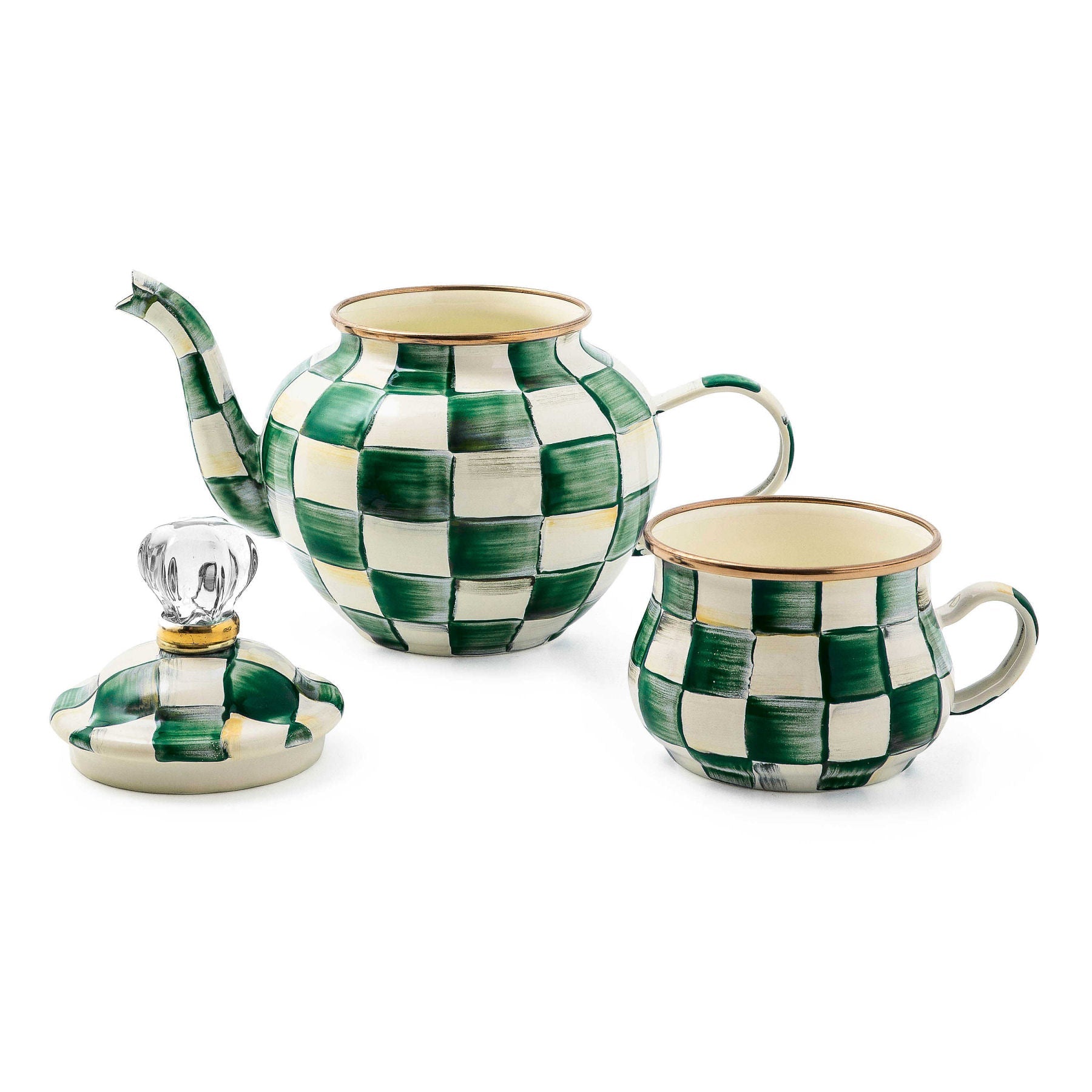 Bubbling over with MacKenzie-Childs style, our Emerald Check High Tea is ready for your personal tea party. Consisting of a pot, cup, and lid made of heavy-gauge steel, it’s decorated with hand-painted green checks and rimmed in bronzed stainless steel.