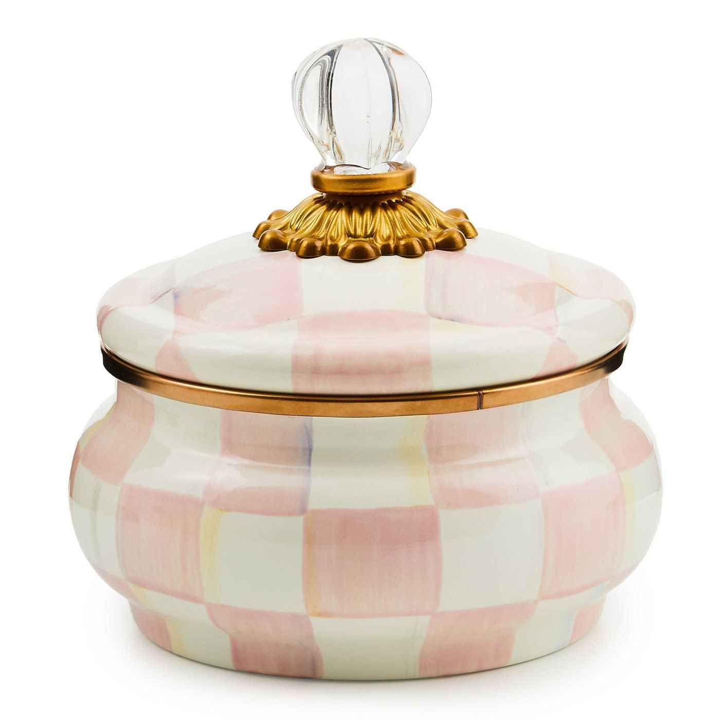 Its heavy-gauge steel underbody is color-glazed, hand-painted with color-dragged checks in a range of rosy hues, rimmed in bronzed stainless steel, and topped with an elegant clear glass knob.