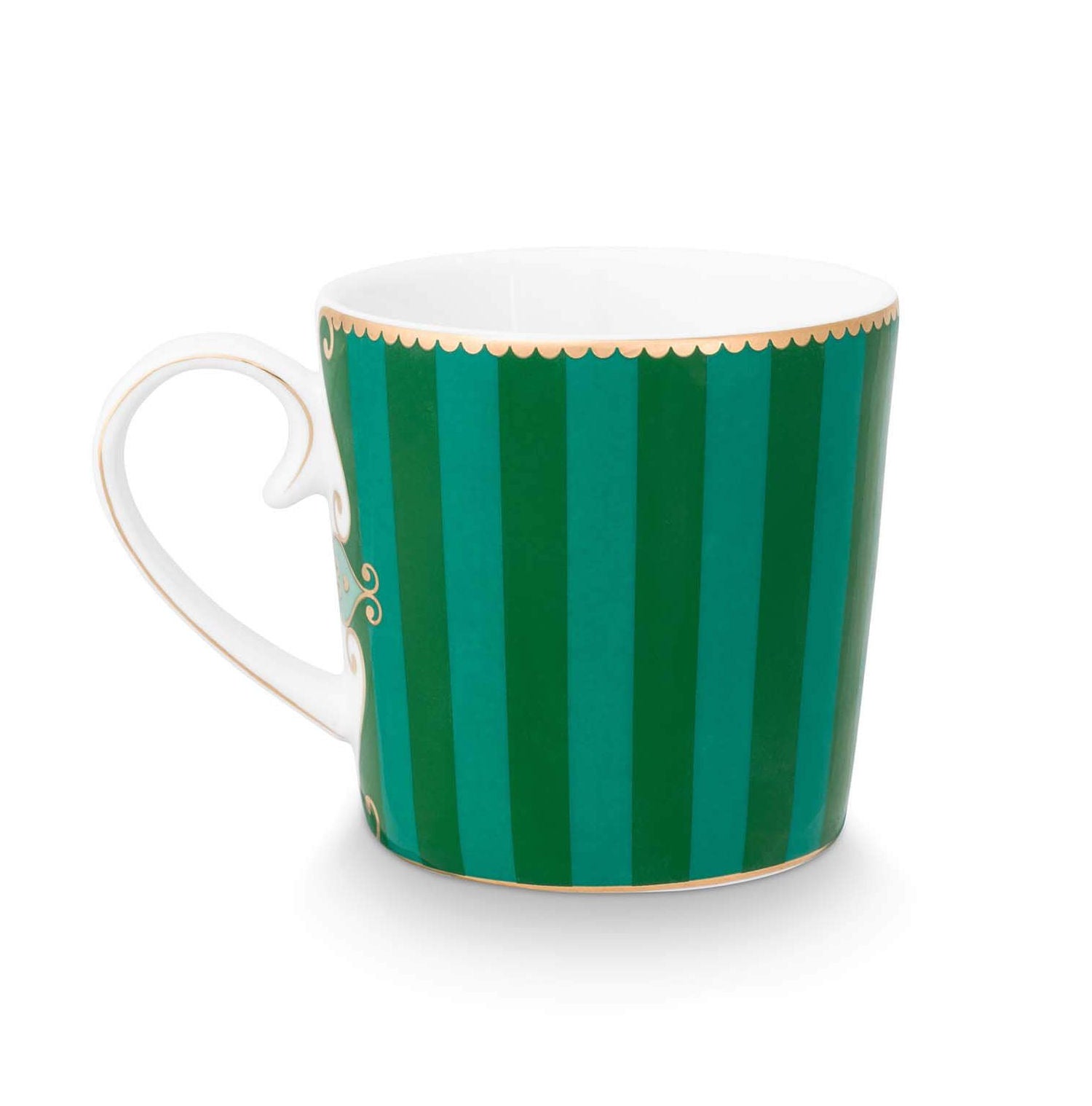 Double the charm with the Set of 2 Small Mugs Love Birds Medallion Striped Emerald Green. These porcelain mugs are decorated with the recognisable Love Birds medallion, framed by playful stripes, floral details and a deep emerald green tone. The refined gold accent adds a touch of elegance. Thanks to their compact size, they're perfect for espresso or a small coffee. Beautifully combinable with other tableware from the Love Birds collection for a colourful and harmonious setting.