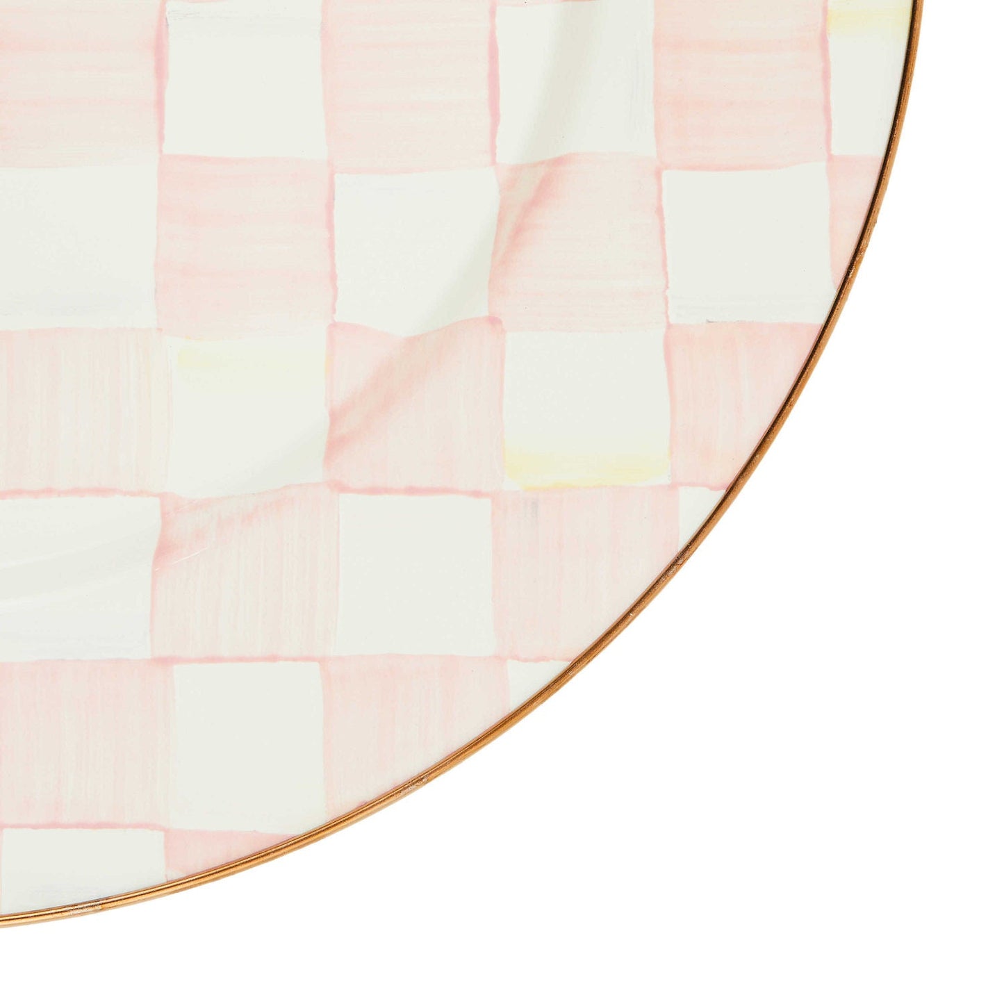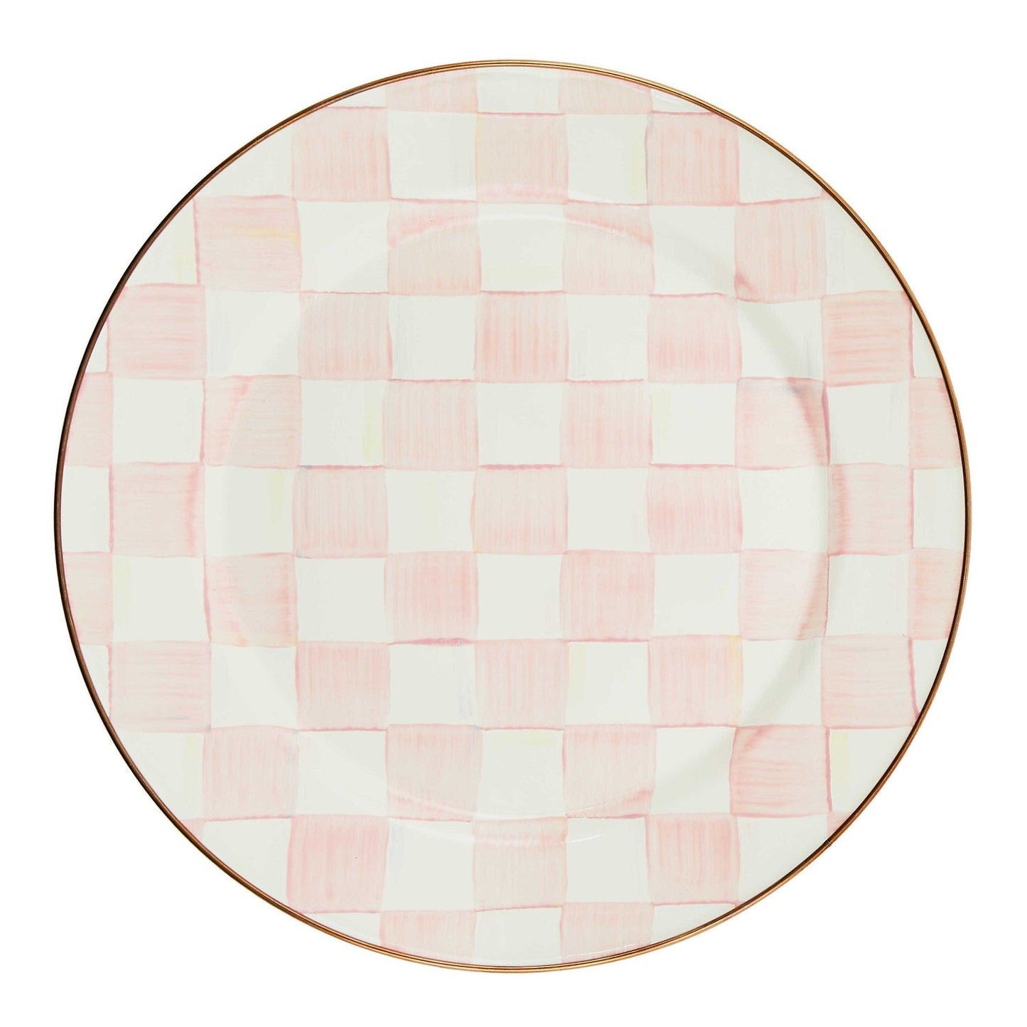 Set a place at the table for our Rosy Check Charger/Plate. Similar in theme to our signature enamel Courtly Check® pattern, Rosy Check checks all our boxes. It’s pretty, it’s pink, and it’s classic. The heavy-gauge steel underbody is glazed with hand-painted, color-dragged checks in a range of rosy hues and rimmed in bronzed stainless steel.