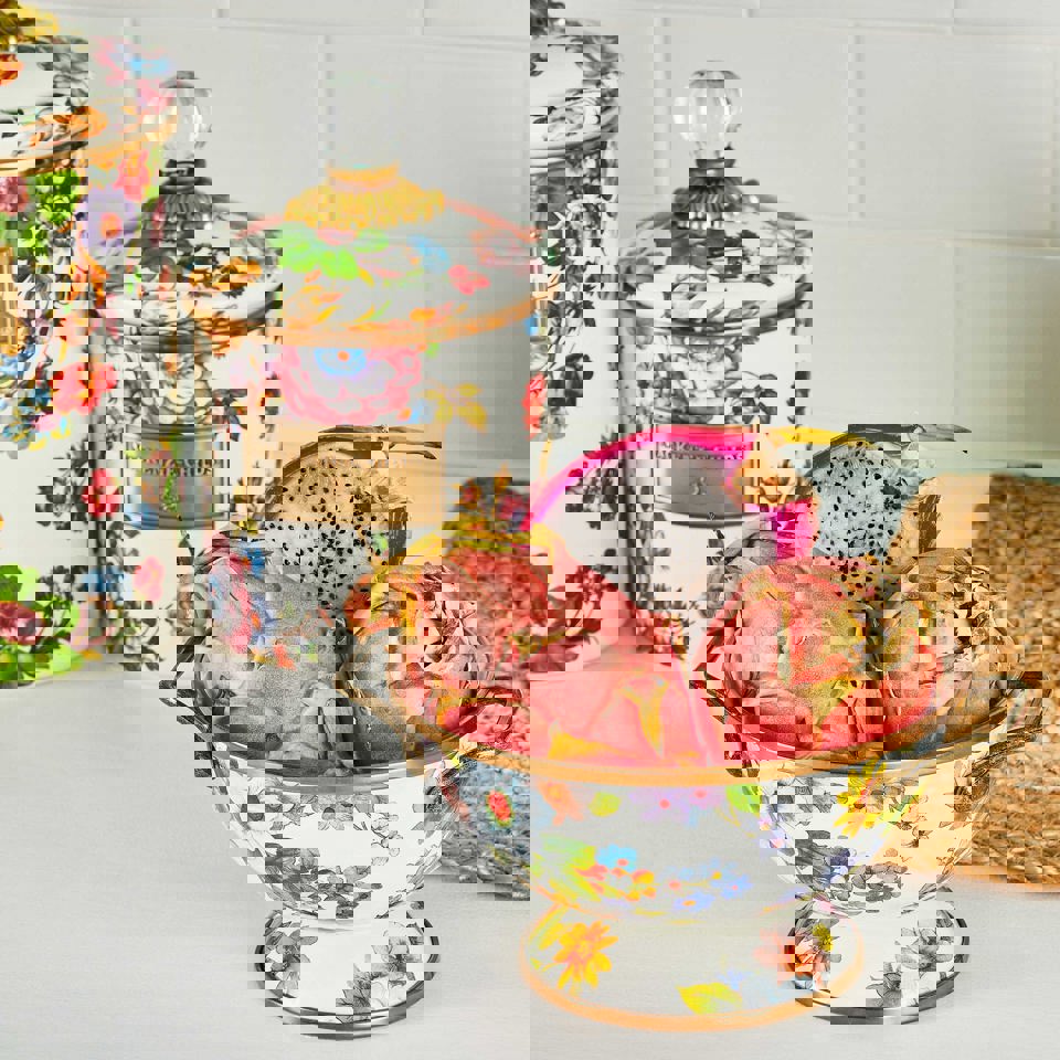Heavy-gauge, hand-glazed steel underbody embellished with hand-applied floral transfers, rimmed in bronzed stainless steel. Lid is topped with a glass finial. Silicone seal inside lid. Pieces may vary due to the handmade nature of each product.