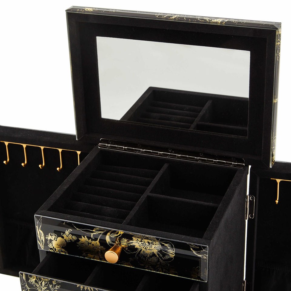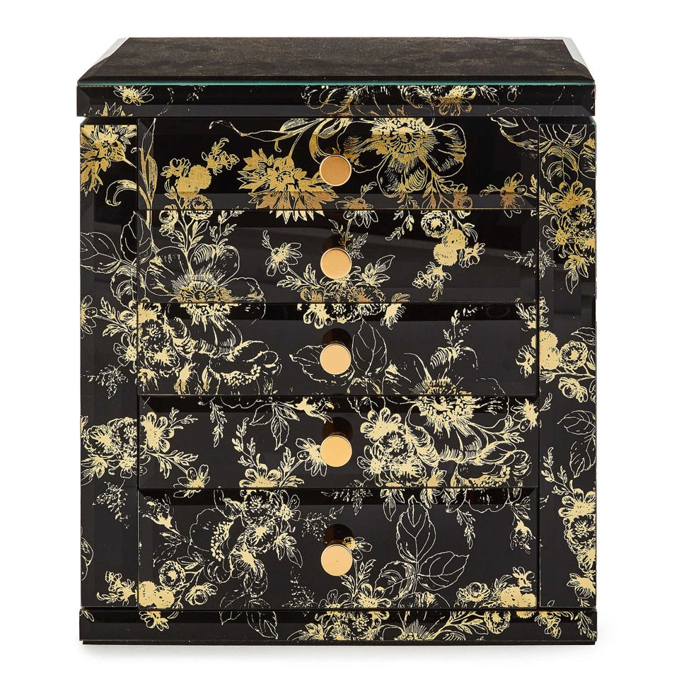This jewelry armoire is a fabulous and functional piece, with four working drawers that have a variety of storage options, including sides that open to hold necklaces and a mirror inside the lid. It’s decorated with a black and gold version of our iconic Flower Market pattern printed on glass, finished with beveled edges.
