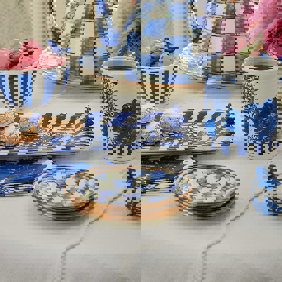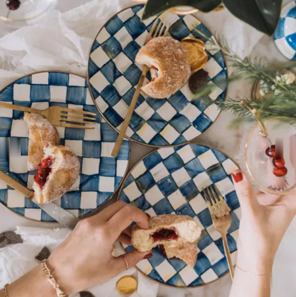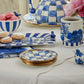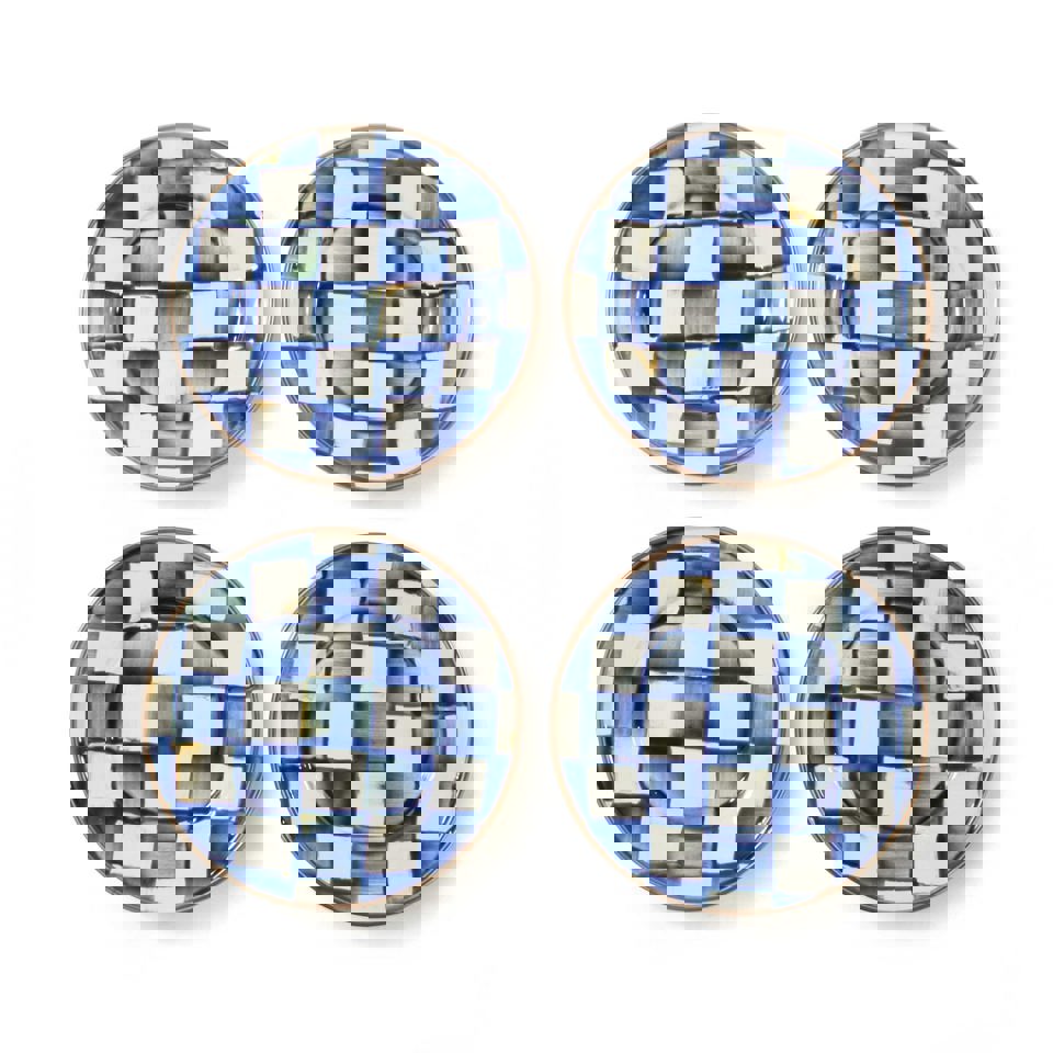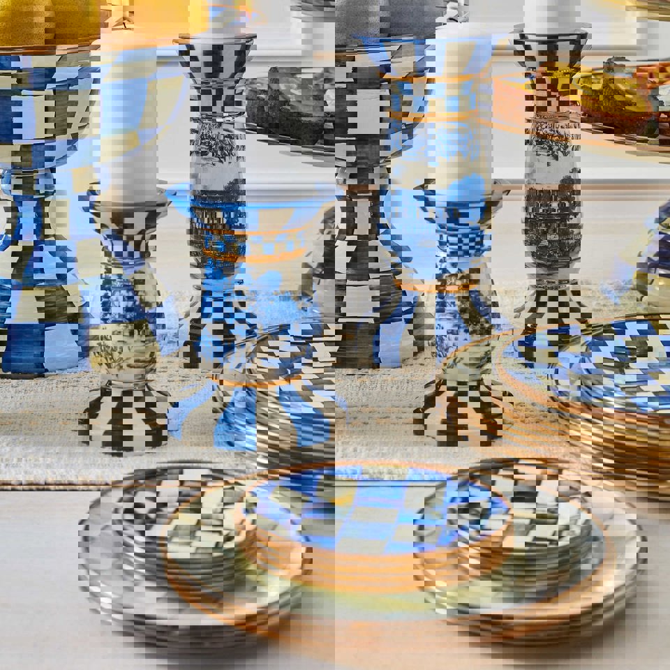 Tapas? Noshes? Tasty treats? The slightly smaller silhouette of the set of four Royal Check Appetizer Plates offers warm, inviting, high-contrast glossy blue checks, hand-painted in a range of blue hues.