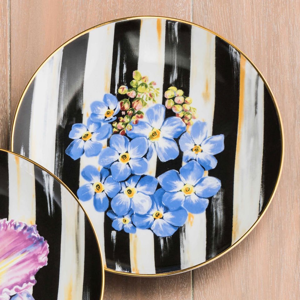 There’s been quite a buzz about our take on formal china. Handcrafted in Portugal, the Forget-Me-Not Thistle & Bee Salad Plate features a spray of cornflower-colored blooms on a field of color-dragged Courtly Stripes. A treat on its own, but even sweeter when served up in a bouquet with the coordinating Trillium, Iris, and The Bride Salad Plates.