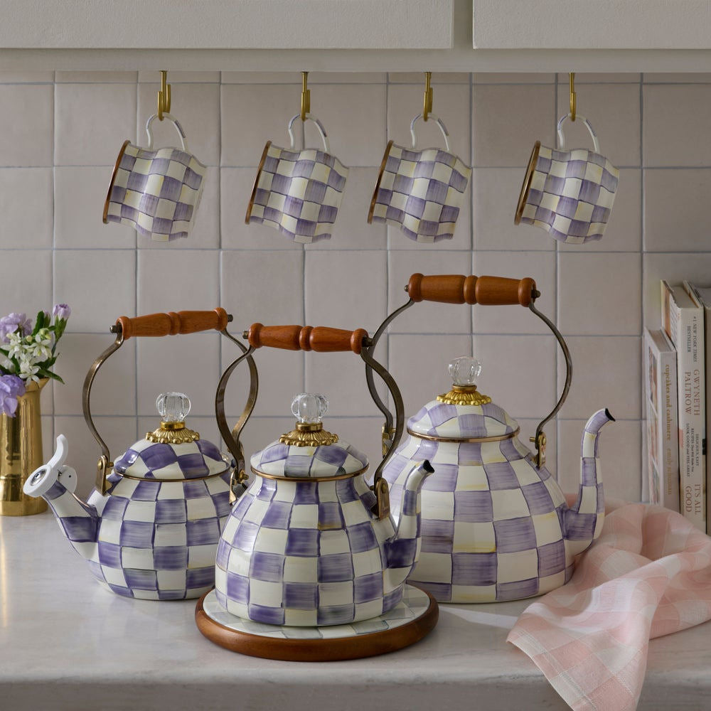 Hearty and handy, our handsome Violet Check Mug is perfect for a cup of hot chocolate or calming tea. Similar in theme to our signature Courtly Check enamel pattern, Violet Check features hand-painted purple checks that are rimmed in bronzed stainless steel.