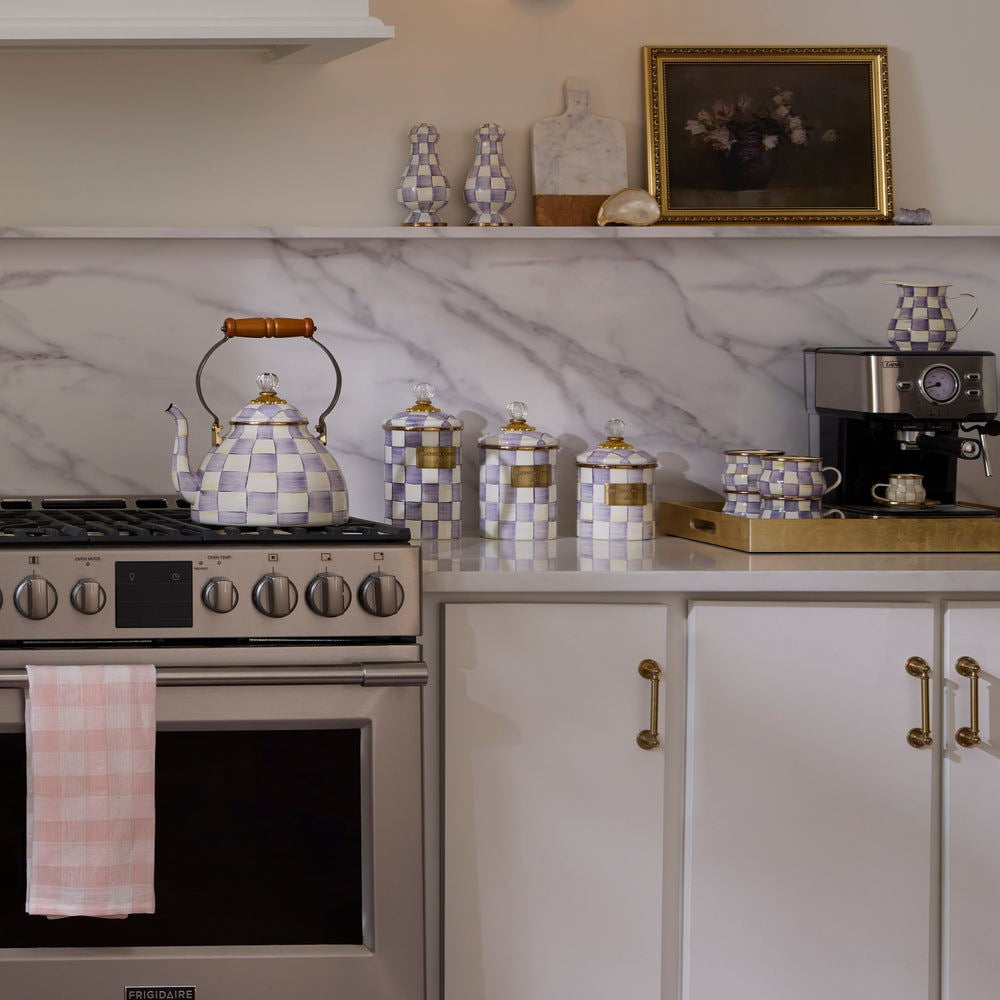 Pantry staples—flour, sugar, and coffee—might seem the most obvious choices with which to fill a Violet Check Small Canister, but the possibilities are endless! Keep it in the kitchen with coffee beans and tea bags, cookies and candies, or dog biscuits and birdseed—or invent new uses around the house. Each enameled steel canister is hand-painted with purple checks and topped with an elegant clear glass knob.