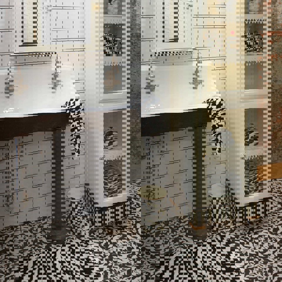 Heavy-gauge, hand-glazed steel underbody with hand-painted Courtly Checks, rimmed in bronzed stainless steel. Pieces may vary due to the handmade nature of each product.