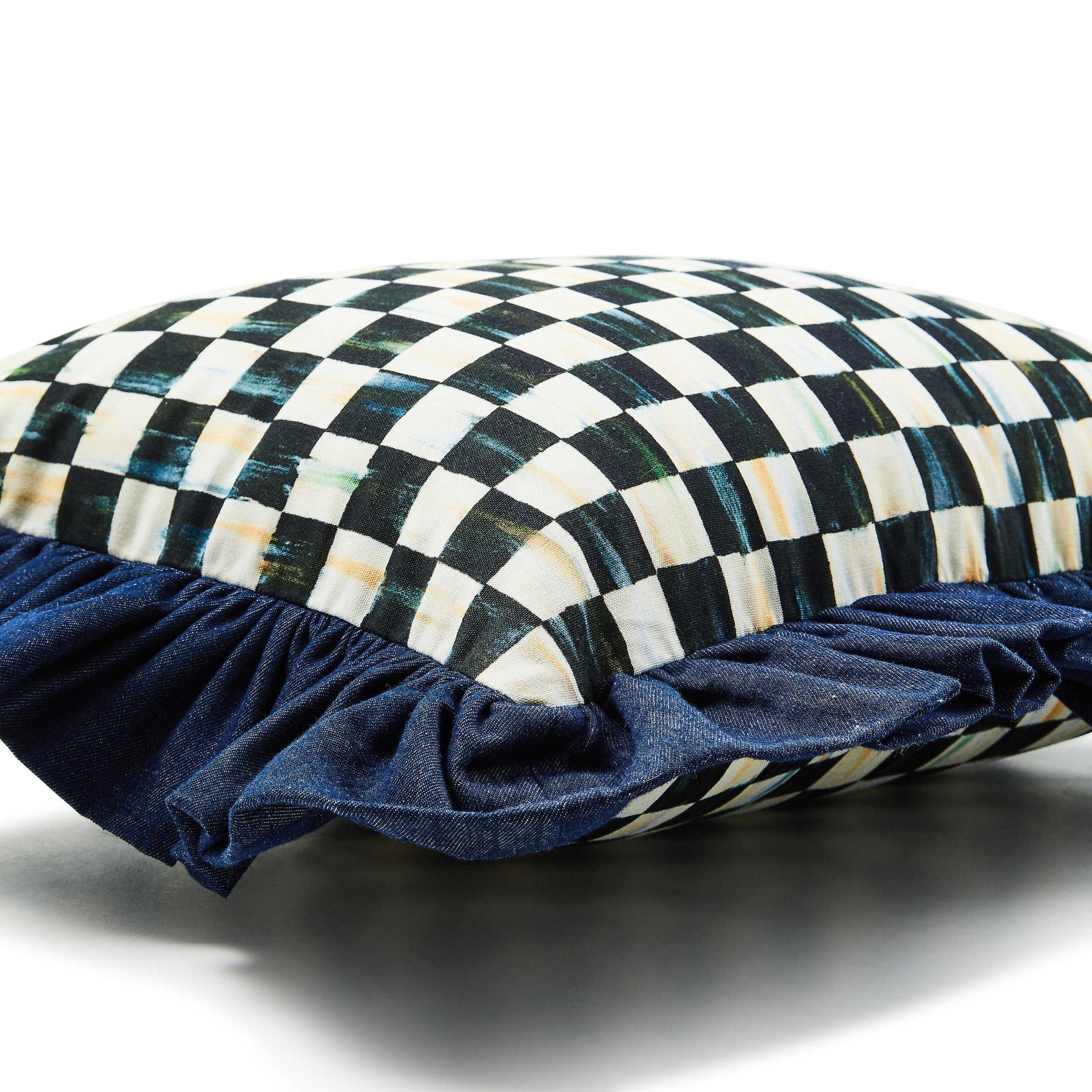 The Courtly Check® With Denim Ruffle Lumbar Pillow features our signature pattern on the front and back, trimmed with a wide ruffle of dark denim.