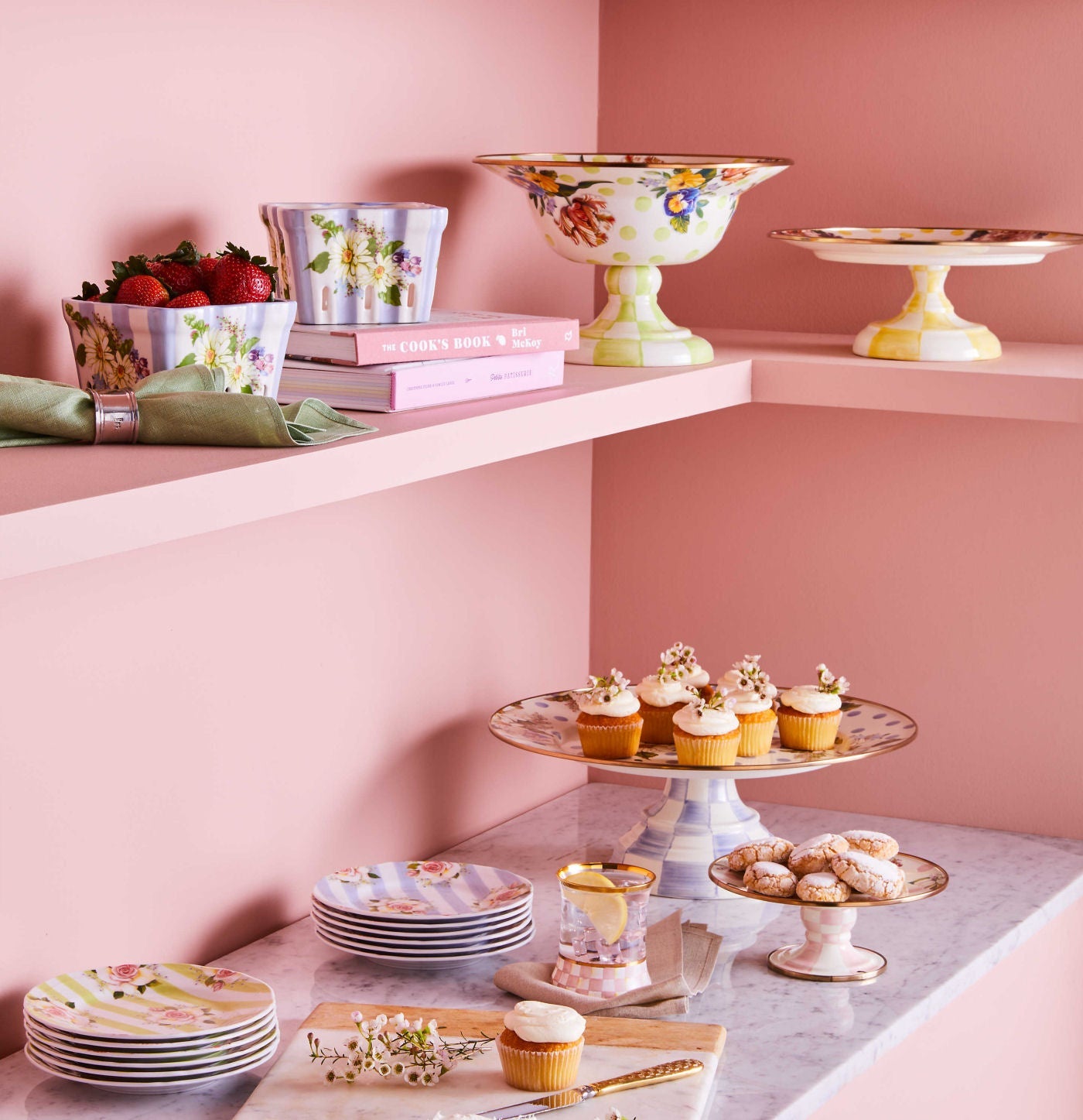 Heavy-gauge, hand-glazed steel underbody embellished with hand-applied floral transfers; base decorated with hand-painted Courtly Checks. Rimmed in bronzed stainless steel. Pieces may vary due to the handmade nature of each product.