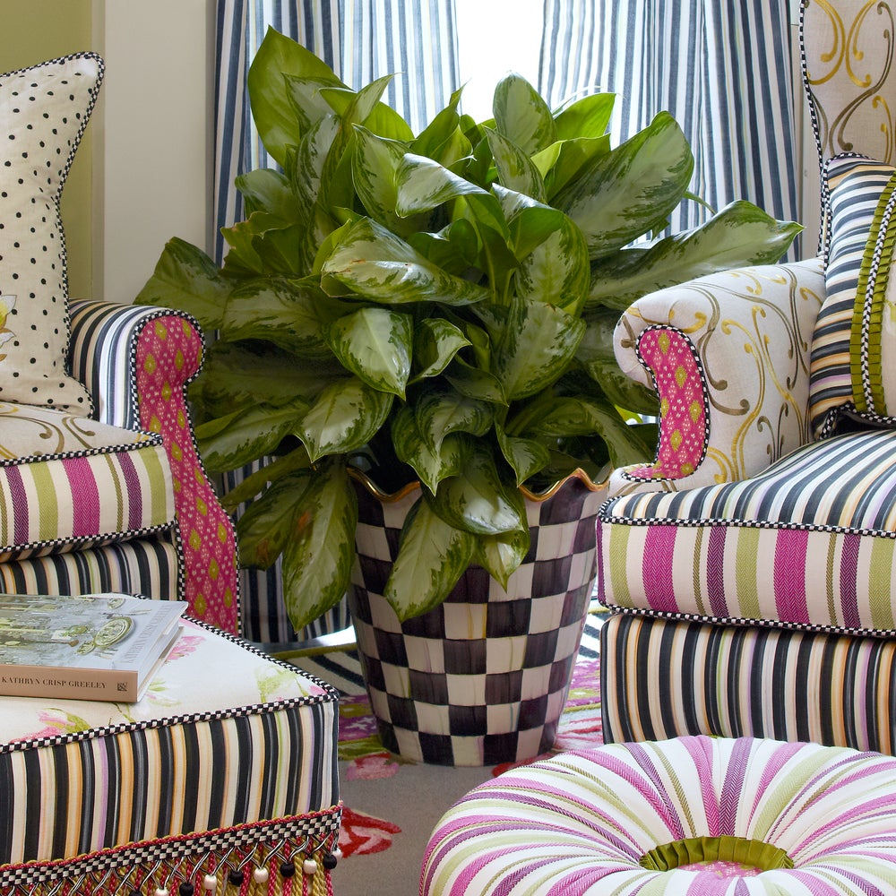 Now, we love all our pieces equally, but when it comes to making a dramatic statement, bigger is fabulously better. Our Courtly Check® Jumbo Flower Pot offers an eye-catching pattern on a delightfully oversized jardinière. On a gently curved silhouette of clay, our artisans hand-paint Courtly Checks®, incorporating a dash of rich jewel tones into each brushstroke. The rim of this versatile pot is embellished with gold lustre to heighten the gorgeous design. Not just for flowers, the iconic pattern of our Courtly Check® Jumbo Flower Pot looks uniquely elegant in a Courtly Check® trio with matching 4" and 8" flower pots in a seasonal display.