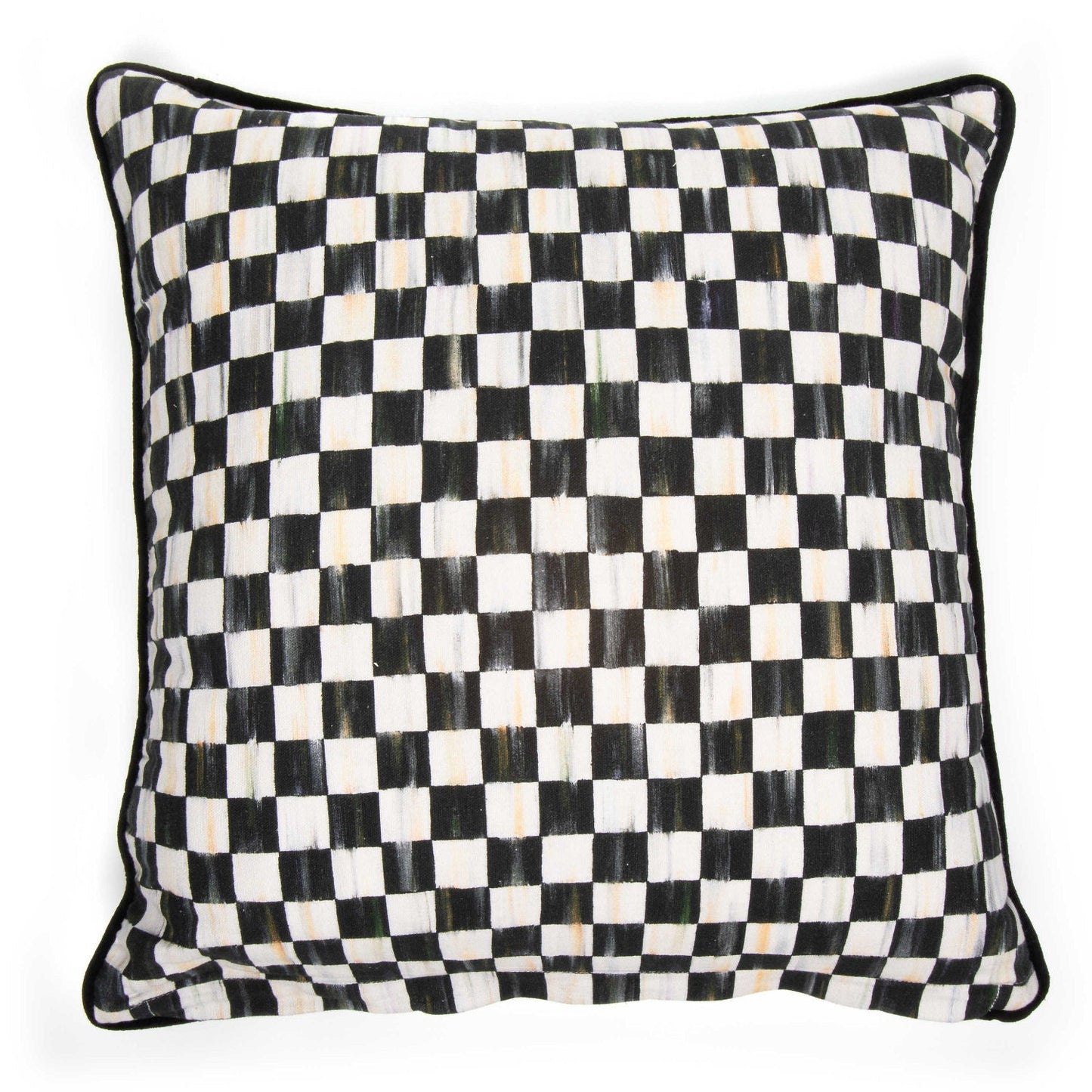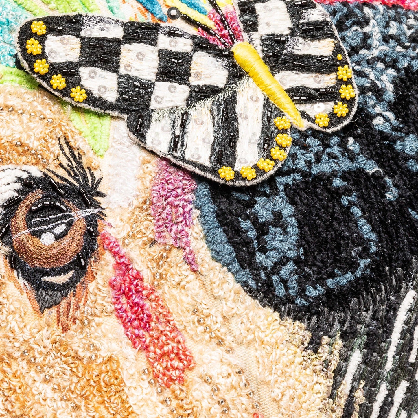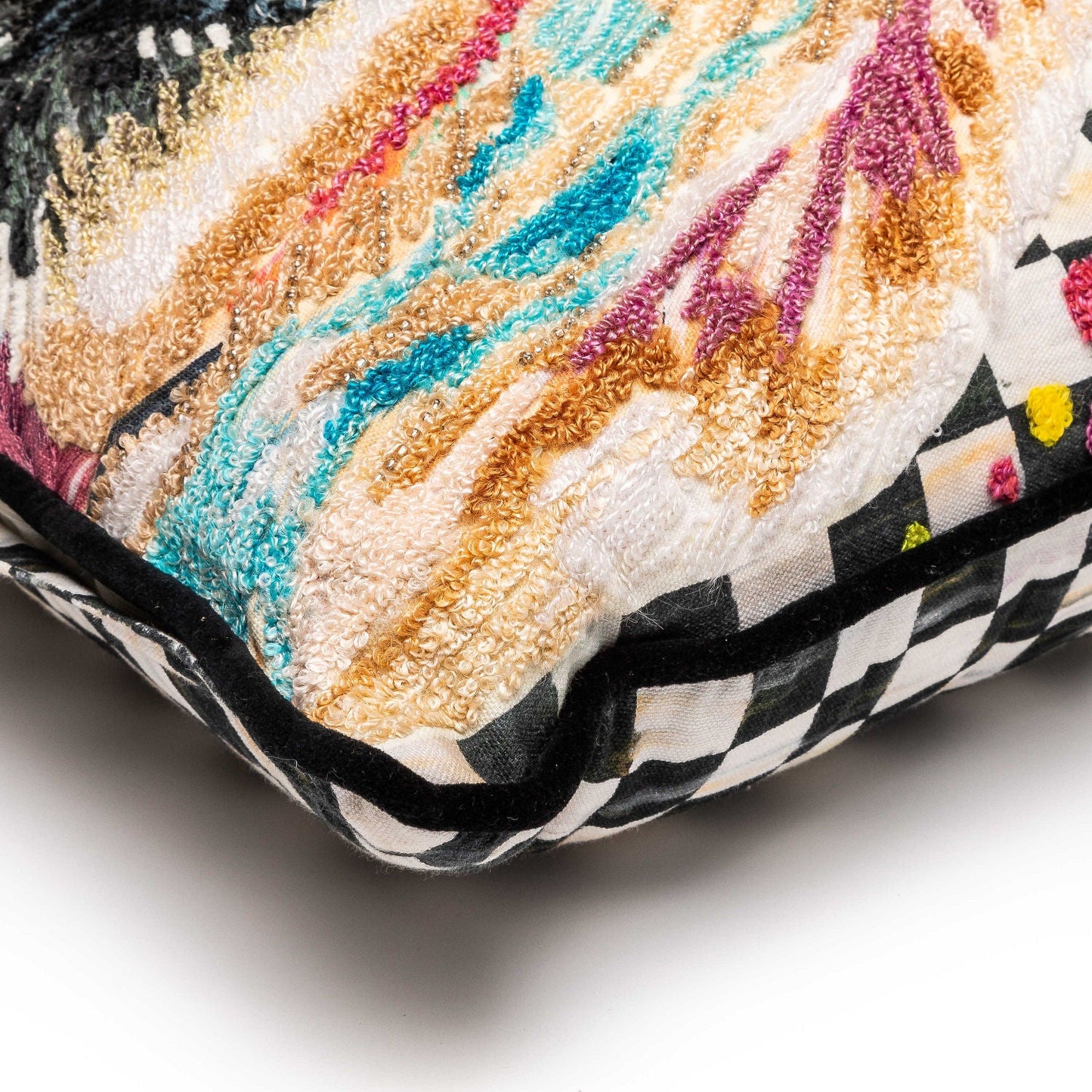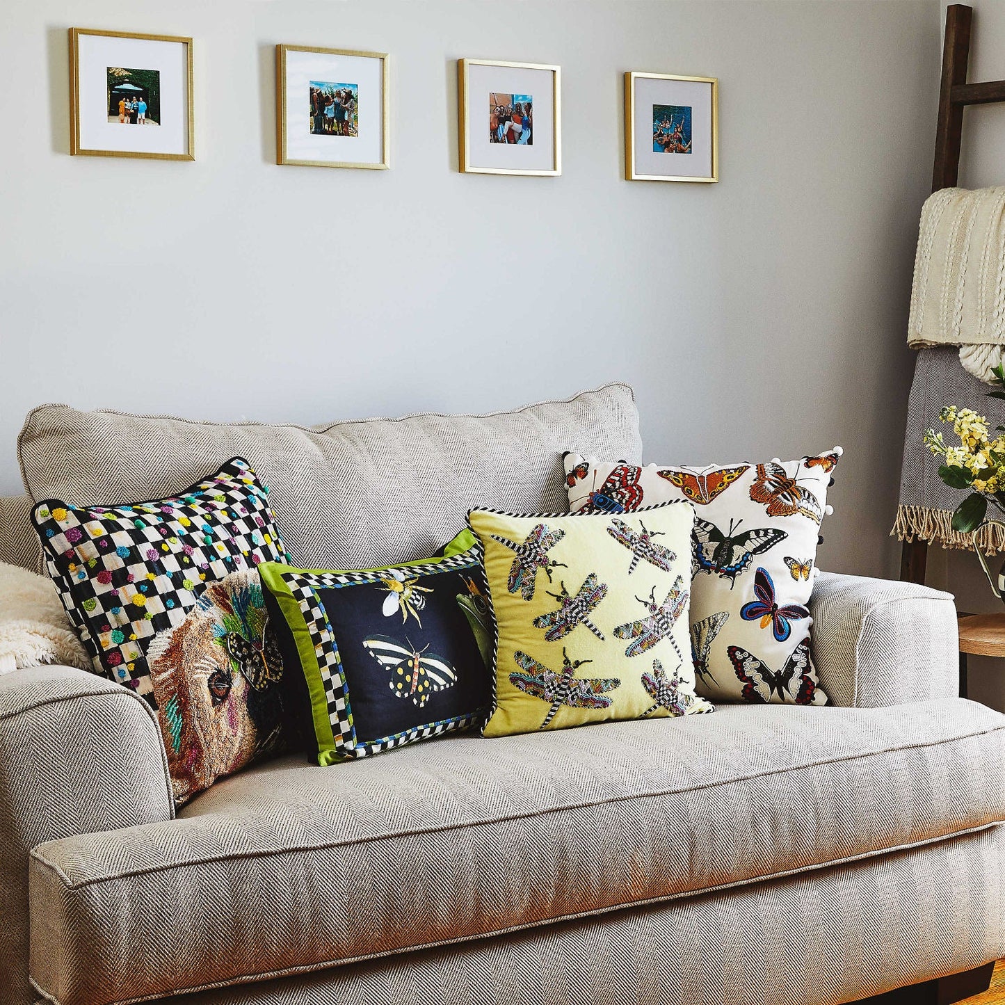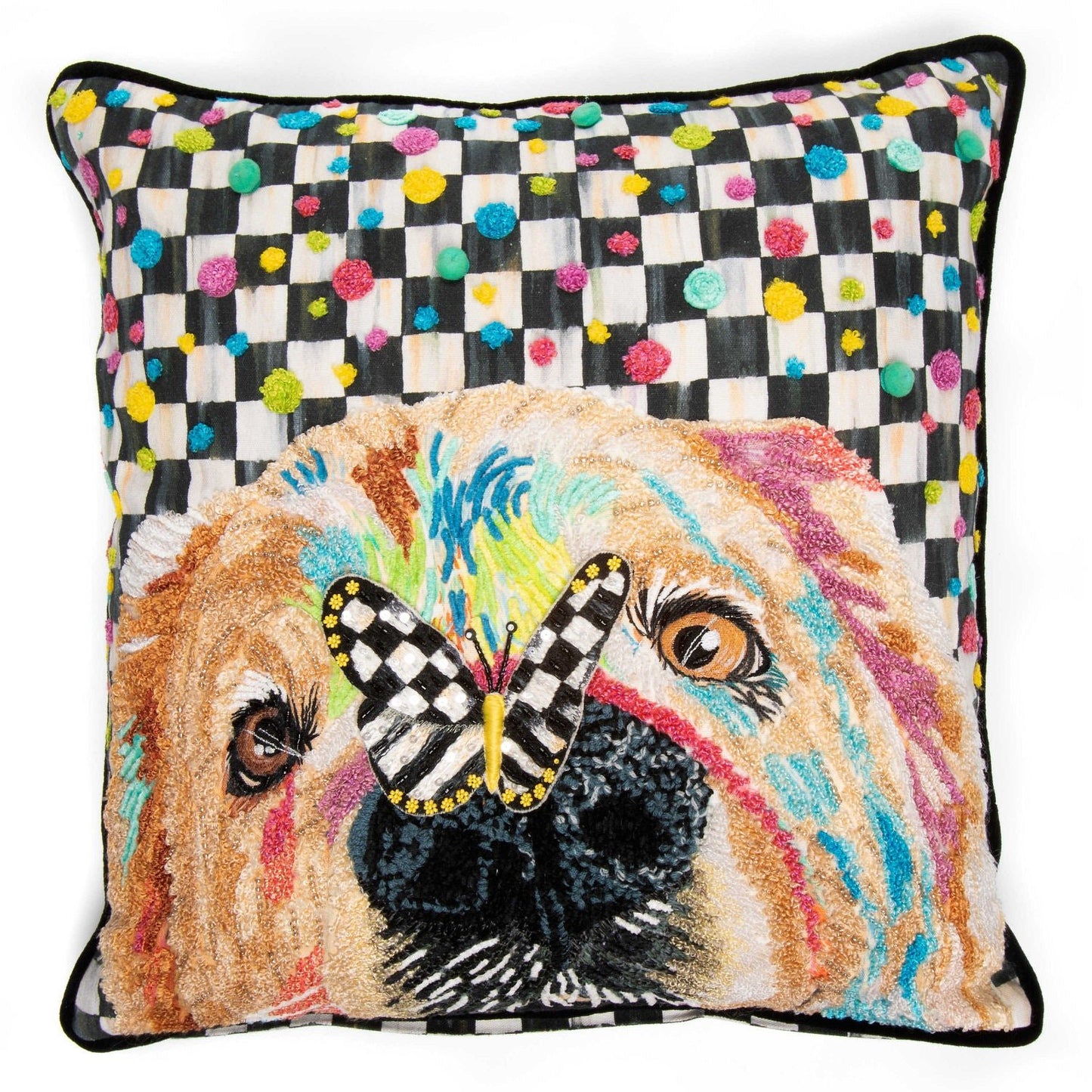 With our Puppy Dot Pillow, we’ve officially gone to the dogs, and we’re delighted to do so. This accent pillow is embroidered and beaded, featuring a playful pup with a three-dimensional butterfly on its nose and textural pop-poms on the Courtly Check® surface. Trimmed with black velvet piping, there’s more Courtly Check on the back.