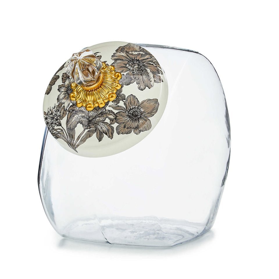 Glass jar; lid has heavy-gauge, hand-glazed steel underbody with hand-applied transfers. Knob assembly includes brass bobeche and glass finial. Pieces may vary due to the handmade nature of each product