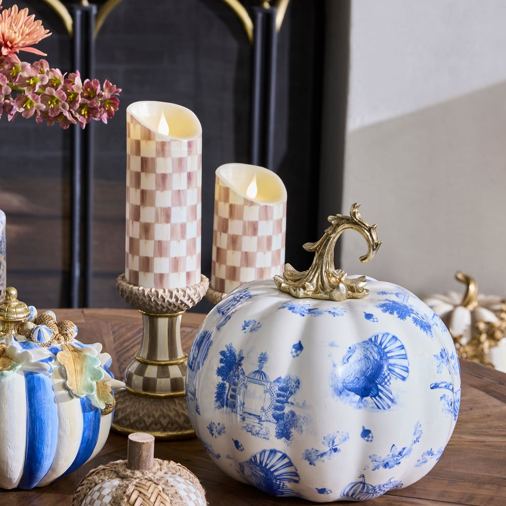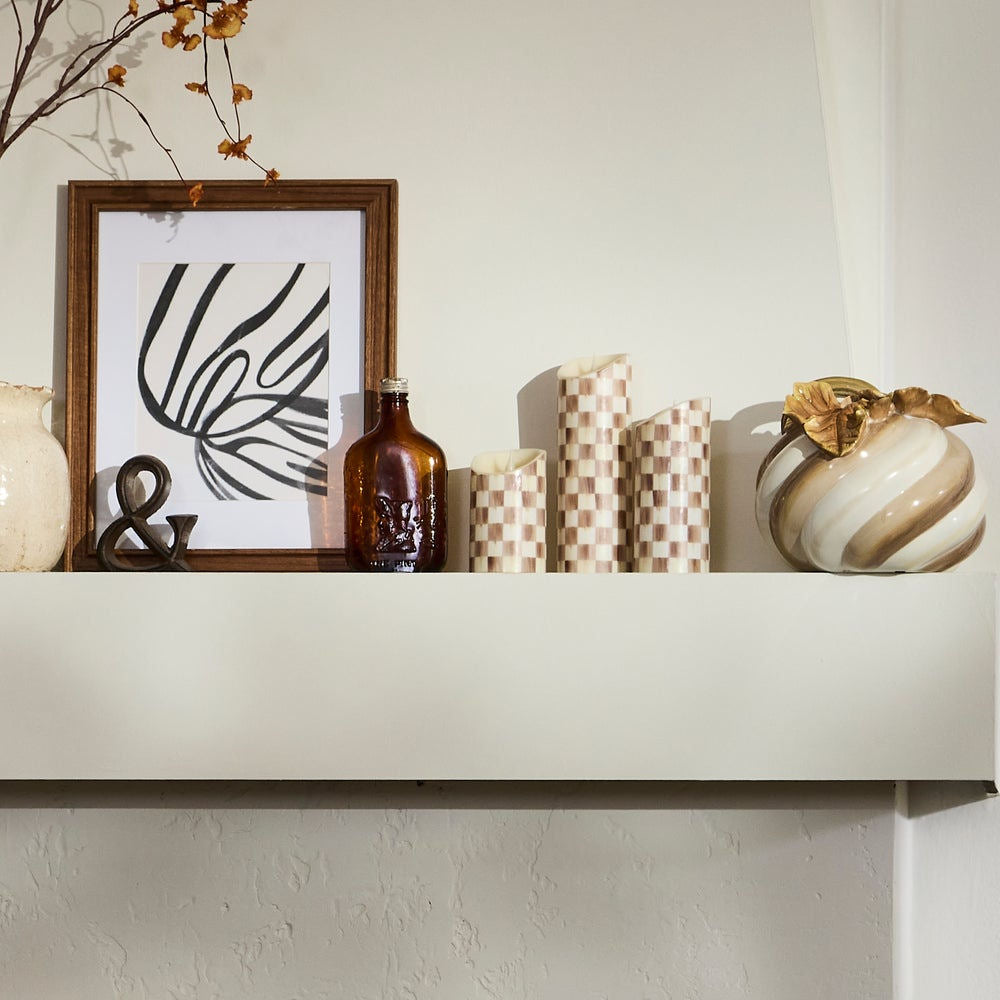 Every celebration can glow with MacKenzie-Childs style with our Mocha Check Flameless 5" Pillar Candle. Decorated with our espresso-inspired check, it features the look of a wax candle but casts a flameless glow created with two AA batteries. The light can be set on a five-hour timer with an included remote control.