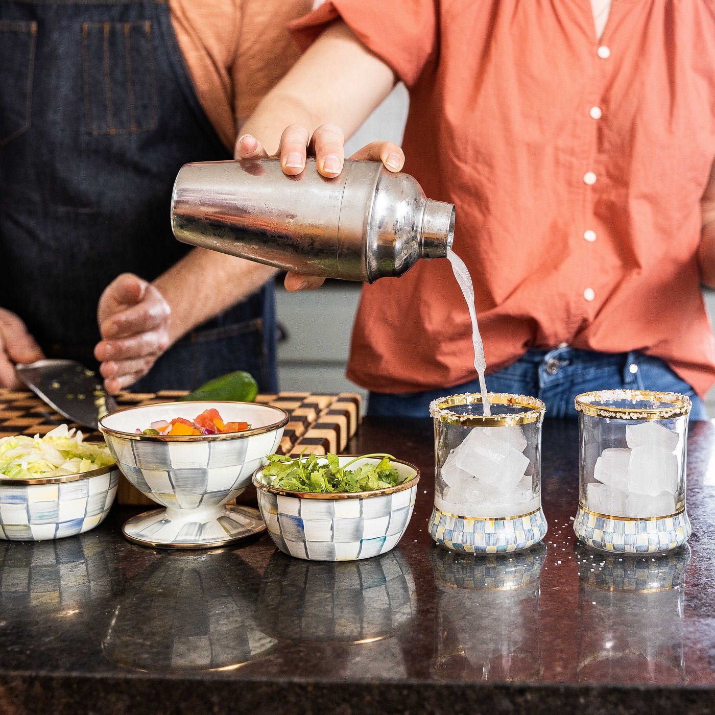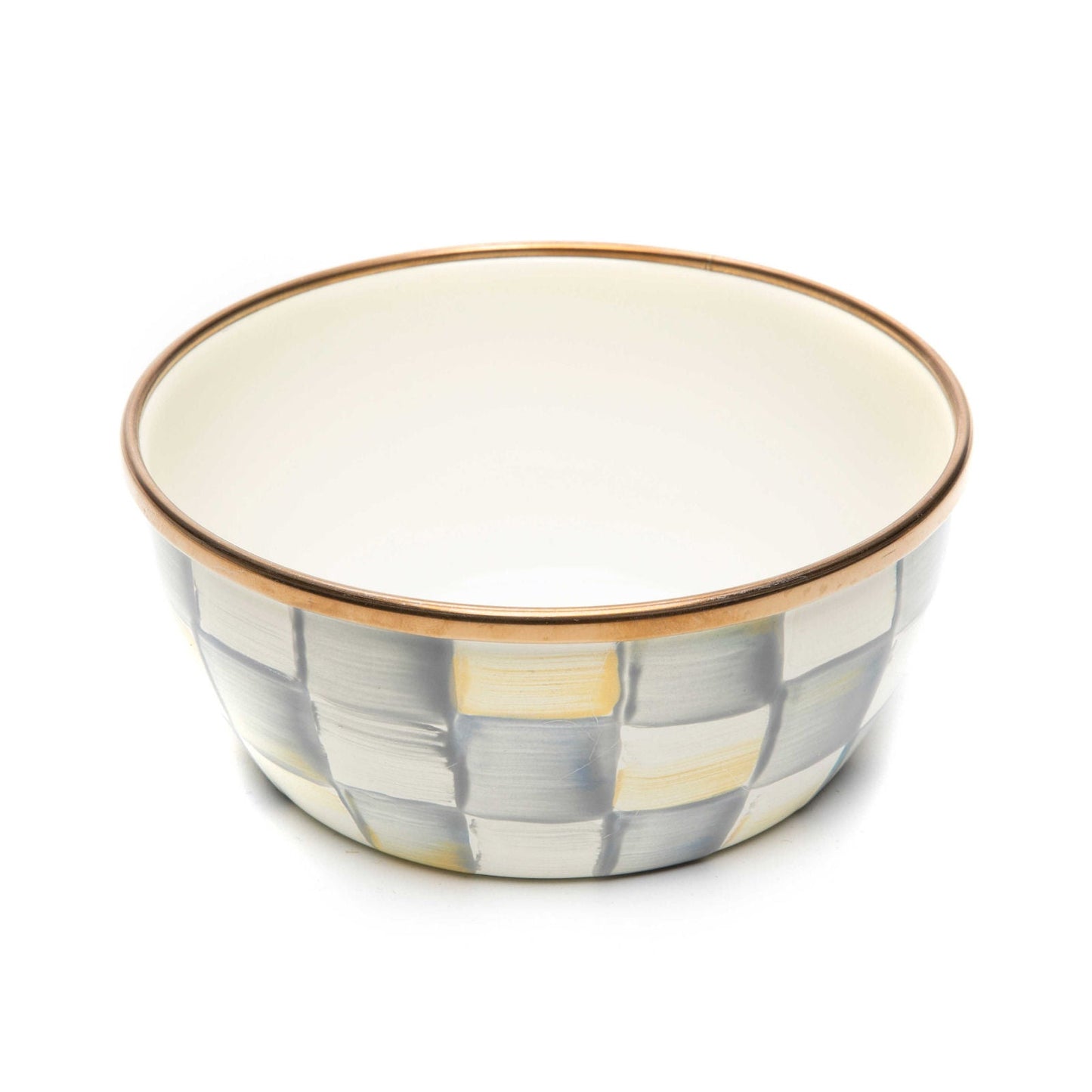 For masters of mise en place, our Sterling Check Pinch Bowl makes prep work a stylish snap. With its just-right size and our grey and white checked pattern, this petite enamel pot is equally charming when brimming with paper clips in a home office or lemon wedges on the wet bar. The heavy-gauge steel underbody is glazed with hand-painted, color-dragged grey checks that are similar in theme to our popular Courtly Check® and rimmed in bronzed stainless steel.