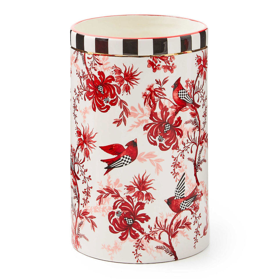 Present holiday bouquets the merry and bright way in this short ceramic vase that’s decorated with a red cardinal and floral toile pattern that’s edged with black and white stripes and gold lustre.