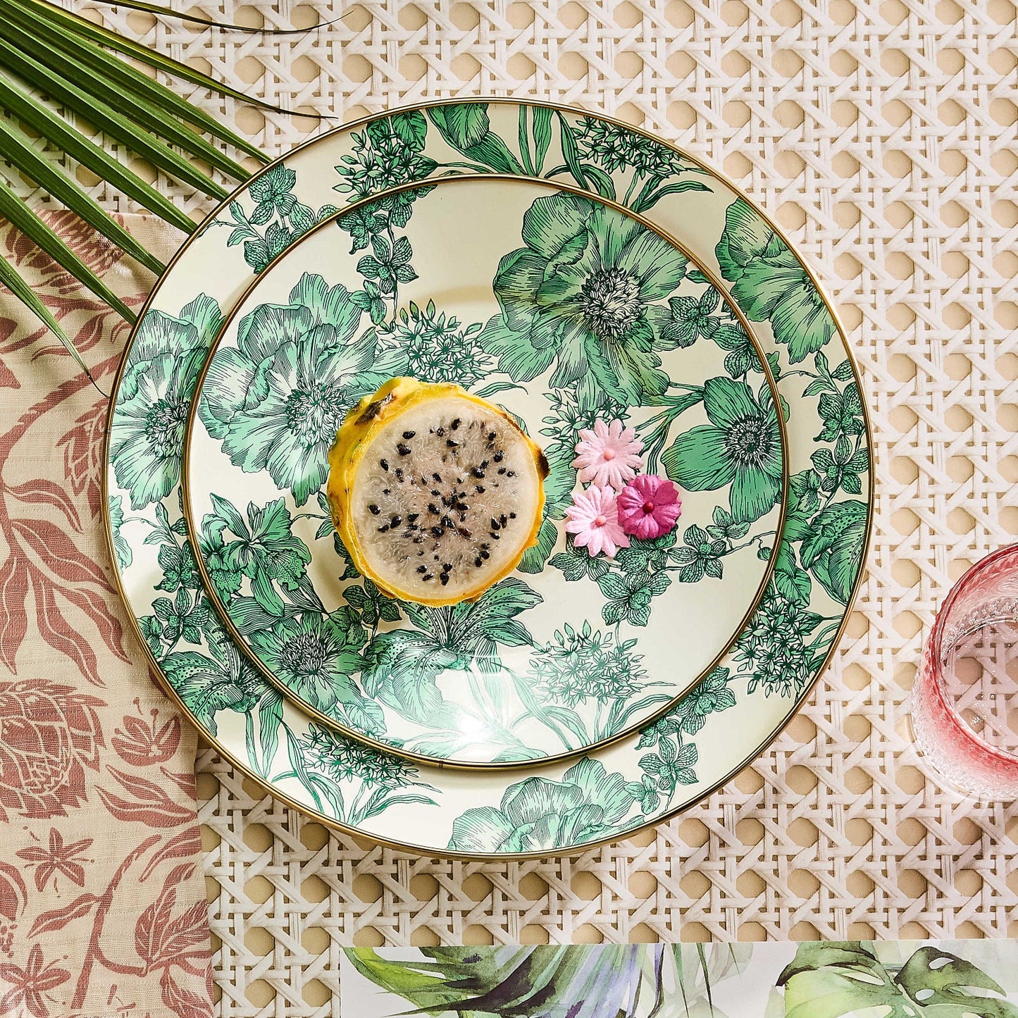 Serve your favorite dishes in style with this green floral enamel salad/dessert plate. The heavy-gauge steel underbody is glazed and decorated with hand-applied transfers and rimmed in bronzed stainless steel. Pairs well with Emerald Check or Sterling Check enamel pieces.