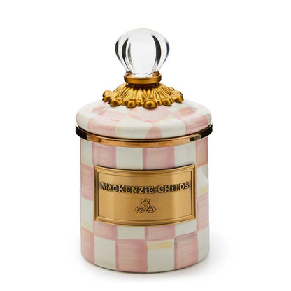 Add to the endless possibilities for our canisters with the Rosy Check Mini Canister. Our smallest sized canister, the Mini stands handsomely alone or harmonizes delightfully in a set. Keep it in the kitchen or invent new uses around the house. Each enameled steel canister is hand-painted with color-dragged checks in a range of rosy hues and topped with a glass knob.