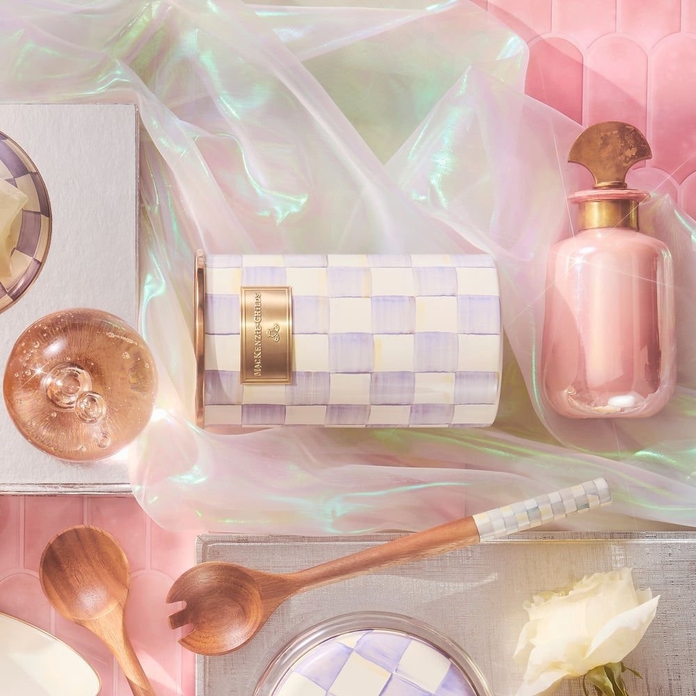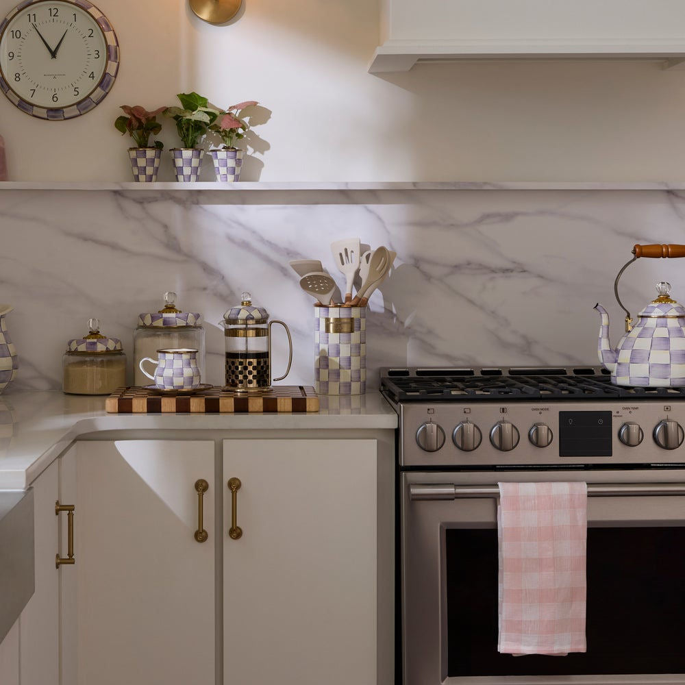 Our extra-tall Violet Check Utensil Holder is the perfect container for everything from slotted spoons to crafting tools. It features hand-painted purple checks on a steel underbody and is rimmed in bronzed stainless steel.