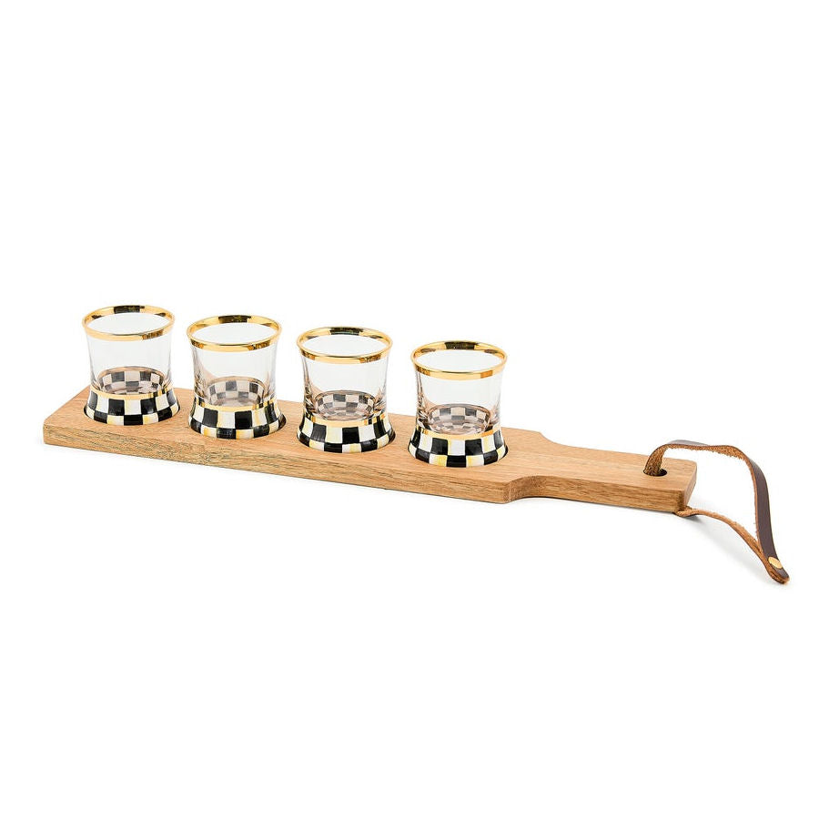 Elevate your tasting experience with our Courtly Check Flight Board, a stunning piece that combines style and craftsmanship. The acacia wood board comes with four hand-painted Courtly Check glasses, each embellished with gold lustre for a touch of elegance. Ideal for sampling wines, spirits, or craft beers, this flight board brings a refined yet playful touch to your entertaining moments.