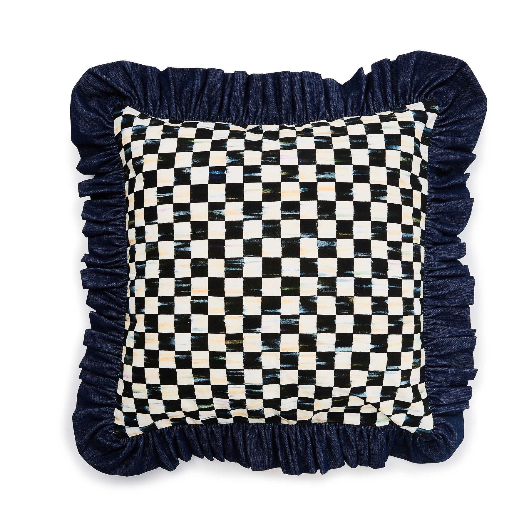 Courtly Check With Denim Ruffle Throw Pillow by MacKenzie-Childs