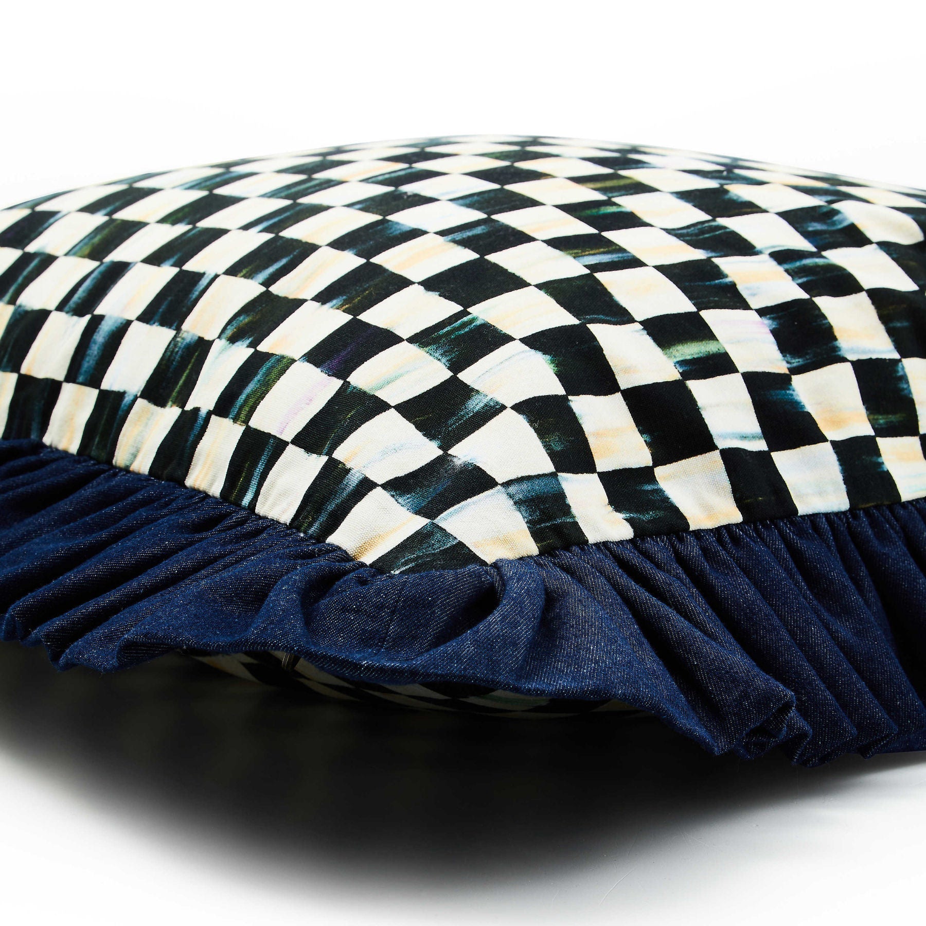 The Courtly Check® With Denim Ruffle Throw Pillow features our signature pattern on the front and back, trimmed with a wide ruffle of dark denim.