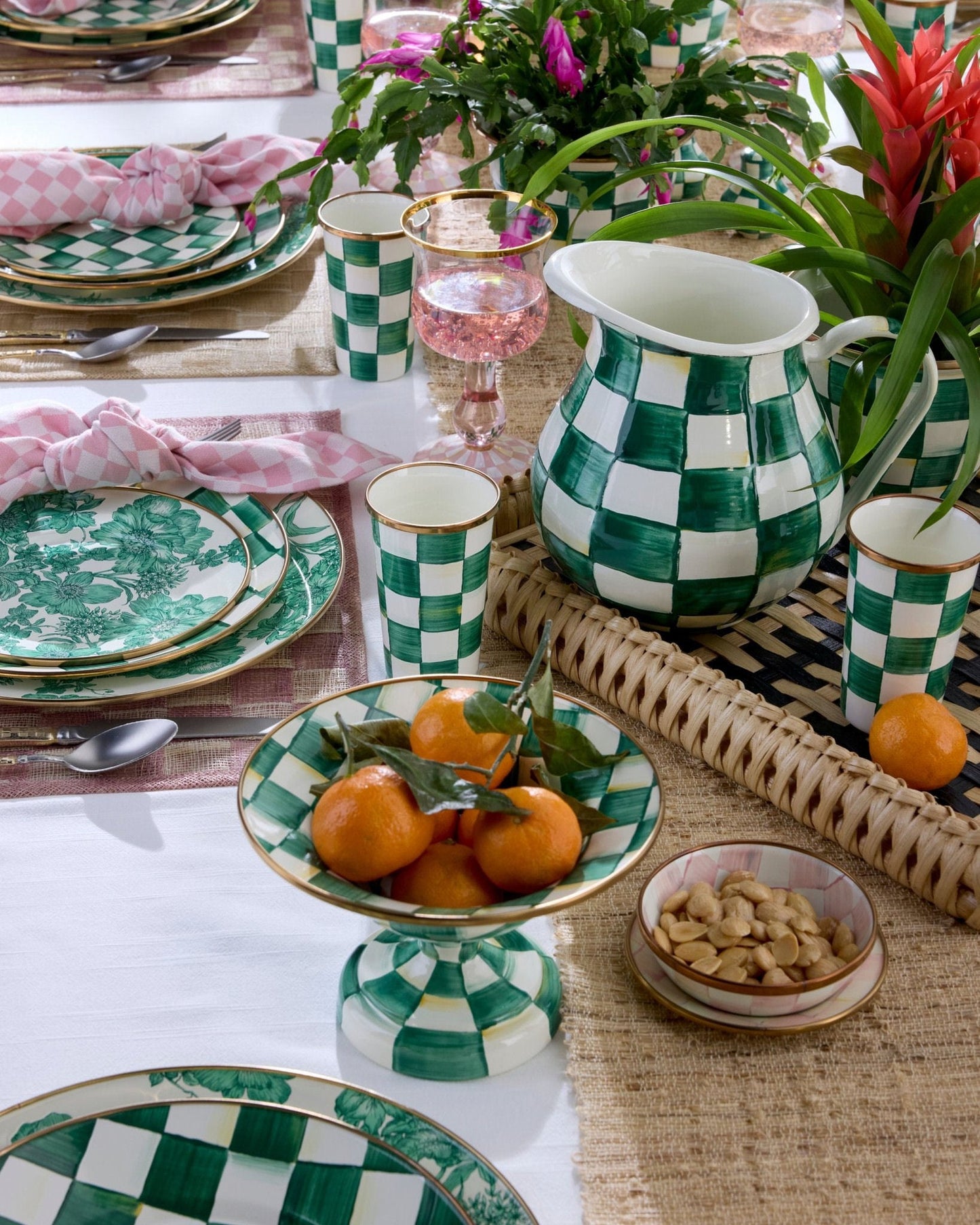 Set a place at the table for our Emerald Check Dinner Plate. Similar in theme to our signature enamel Courtly Check® pattern, Emerald Check features green checks that are hand-painted and rimmed in bronzed stainless steel.