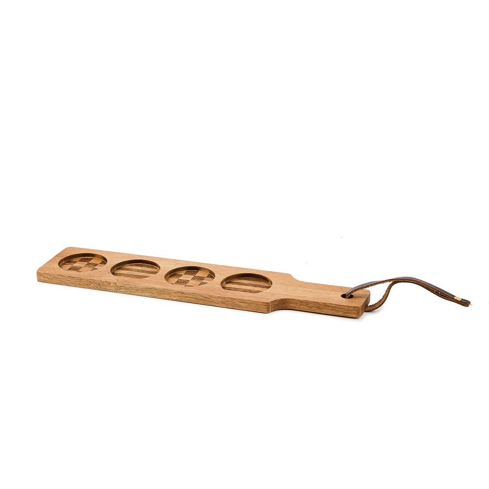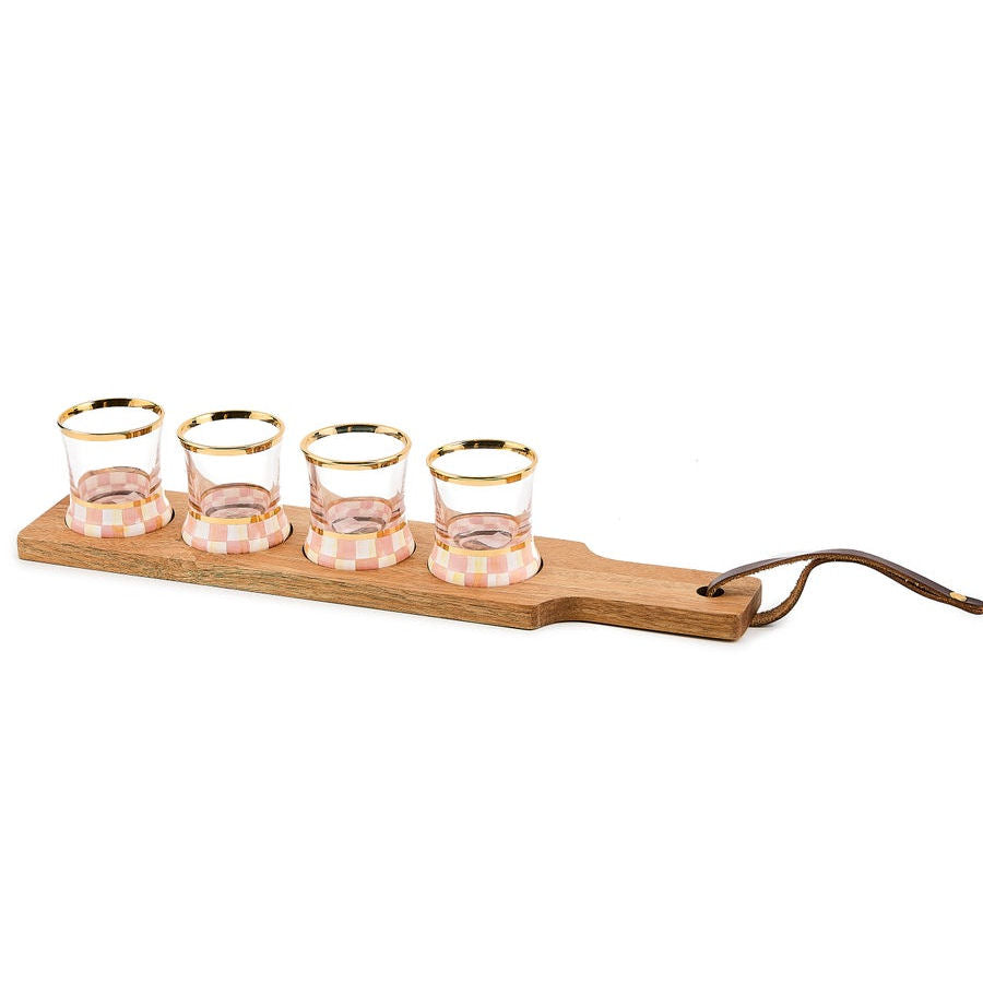 Our Rosy Check Flight Board is a must-have for those who dream of hosting their own wine-tasting soirée. The set of four hand-painted glasses with gold lustre embellishments nestle perfectly into the stunning acacia wood board. Perfect for serving up a petite cocktail to guests, or sampling a variety of beverages.